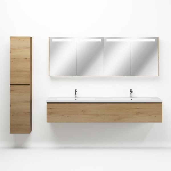 Greeploos badkamermeubel in de kleur eiken natuur is 200 cm breed. De wastafel is vervaardig in polystone en heeft de kleur wit. Dit badkamermeubel met deze wastafel is leverbaar tussen de 60 cm t/m 160 cm