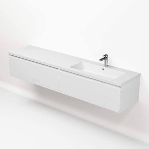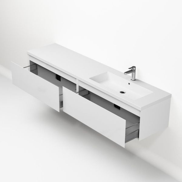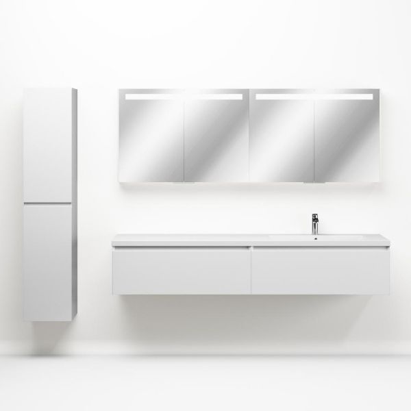 Greeploos badkamermeubel in de kleur wit hoogglans is 200 cm breed. De wastafel is vervaardig in polystone en heeft de kleur wit. Dit badkamermeubel met deze wastafel is leverbaar tussen de 60 cm t/m 160 cm