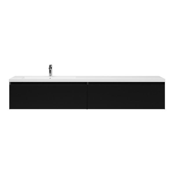 Greeploos badkamermeubel in de kleur zwart mat is 200 cm breed. De wastafel is vervaardig in polystone en heeft de kleur wit. Dit badkamermeubel met deze wastafel is leverbaar tussen de 60 cm t/m 160 cm
