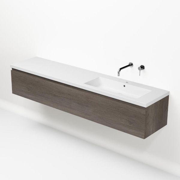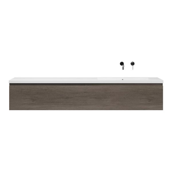 Greeploos badkamermeubel in de kleur olm donker grijs is 200 cm breed. De wastafel is vervaardig in polystone en heeft de kleur wit. Dit badkamermeubel met deze wastafel is leverbaar tussen de 60 cm t/m 160 cm