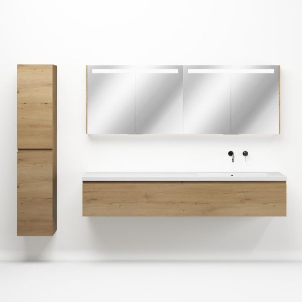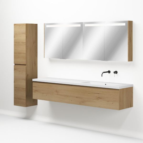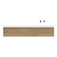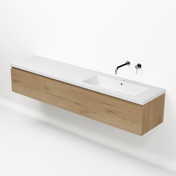 Greeploos badkamermeubel in de kleur eiken natuur is 200 cm breed. De wastafel is vervaardig in polystone en heeft de kleur wit. Dit badkamermeubel met deze wastafel is leverbaar tussen de 60 cm t/m 160 cm