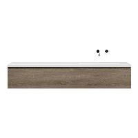 Greeploos badkamermeubel in de kleur eiken donker is 200 cm breed. De wastafel is vervaardig in polystone en heeft de kleur wit. Dit badkamermeubel met deze wastafel is leverbaar tussen de 60 cm t/m 160 cm