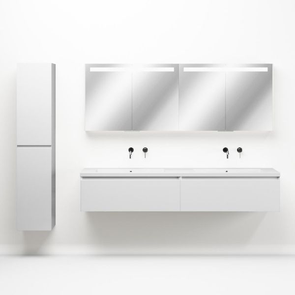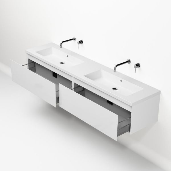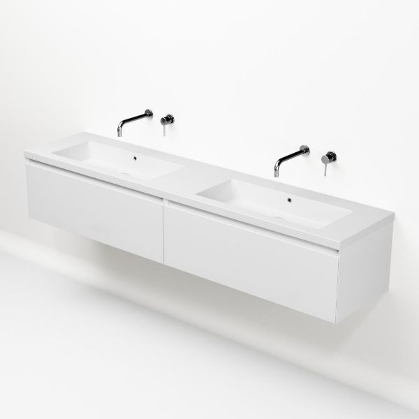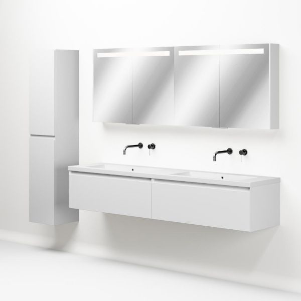 Greeploos badkamermeubel in de kleur wit hoogglans is 200 cm breed. De wastafel is vervaardig in polystone en heeft de kleur wit. Dit badkamermeubel met deze wastafel is leverbaar tussen de 60 cm t/m 160 cm