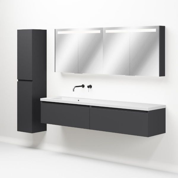 Greeploos badkamermeubel in de kleur antraciet mat is 200 cm breed. De wastafel is vervaardig in polystone en heeft de kleur wit. Dit badkamermeubel met deze wastafel is leverbaar tussen de 60 cm t/m 160 cm
