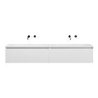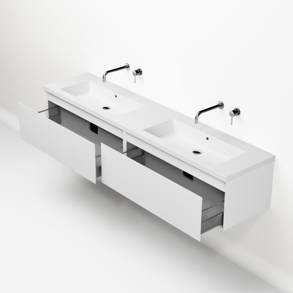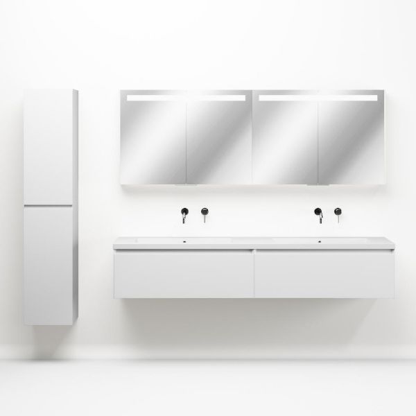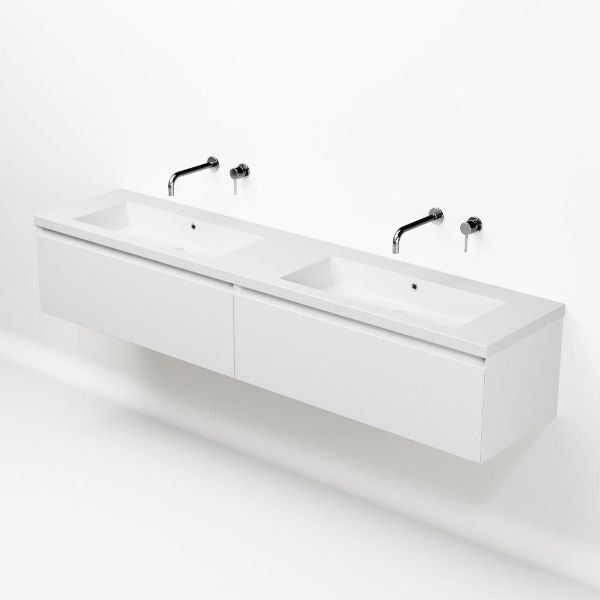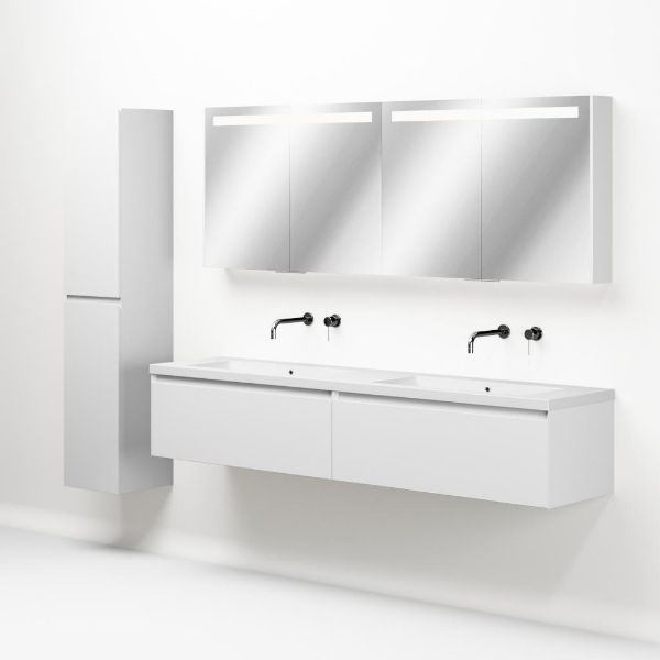 Greeploos badkamermeubel in de kleur wit mat is 200 cm breed. De wastafel is vervaardig in polystone en heeft de kleur wit. Dit badkamermeubel met deze wastafel is leverbaar tussen de 60 cm t/m 160 cm