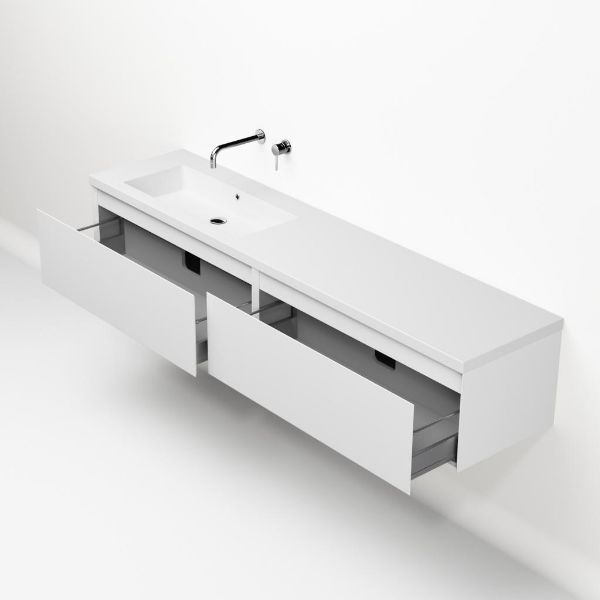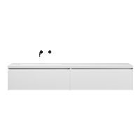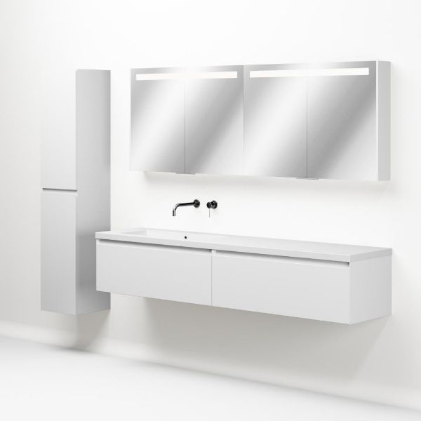 Greeploos badkamermeubel in de kleur wit mat is 200 cm breed. De wastafel is vervaardig in polystone en heeft de kleur wit. Dit badkamermeubel met deze wastafel is leverbaar tussen de 60 cm t/m 160 cm
