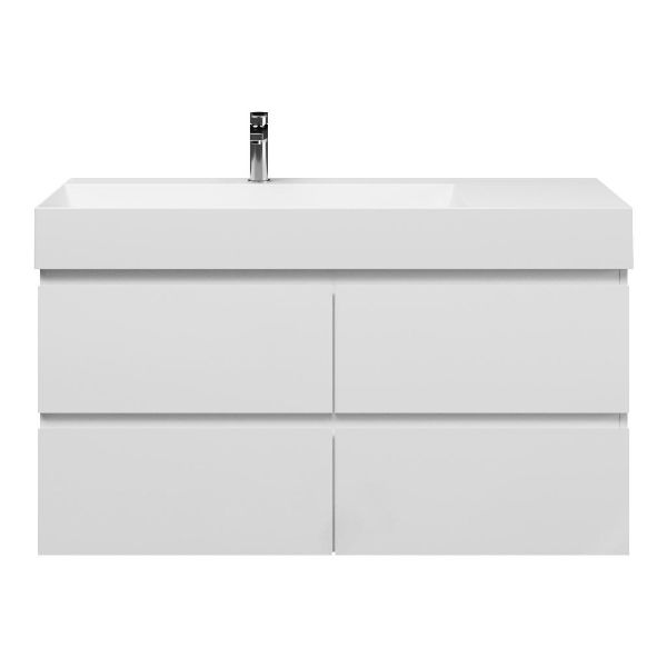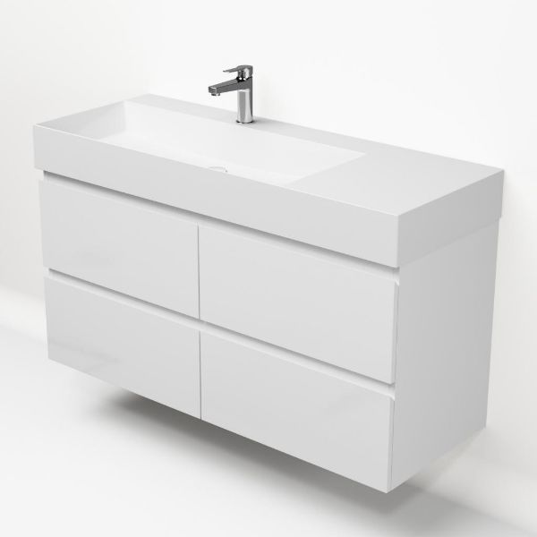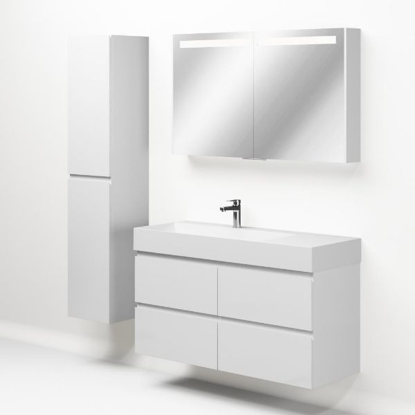 Greeploos badkamermeubel in de kleur wit hoogglans is 120 cm breed. De wastafel is vervaardig in keramiek en heeft de kleur wit keramiek. Dit badkamermeubel met deze wastafel is leverbaar tussen de 60 cm t/m 160 cm