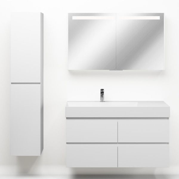 Greeploos badkamermeubel in de kleur wit mat is 120 cm breed. De wastafel is vervaardig in keramiek en heeft de kleur wit keramiek. Dit badkamermeubel met deze wastafel is leverbaar tussen de 60 cm t/m 160 cm