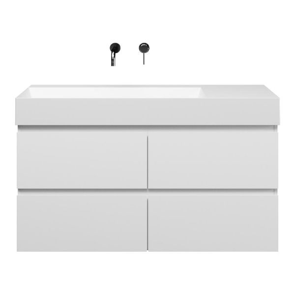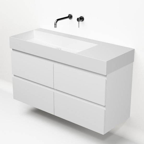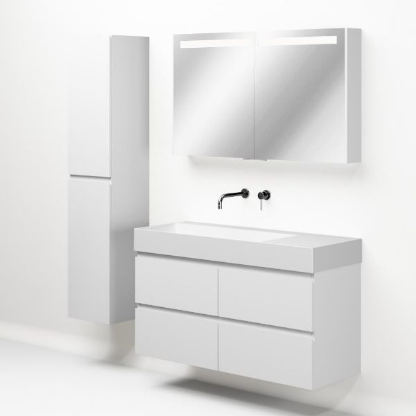 Greeploos badkamermeubel in de kleur wit mat is 120 cm breed. De wastafel is vervaardig in keramiek en heeft de kleur wit mat keramiek. Dit badkamermeubel met deze wastafel is leverbaar tussen de 60 cm t/m 160 cm