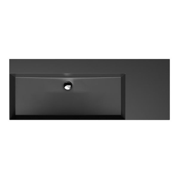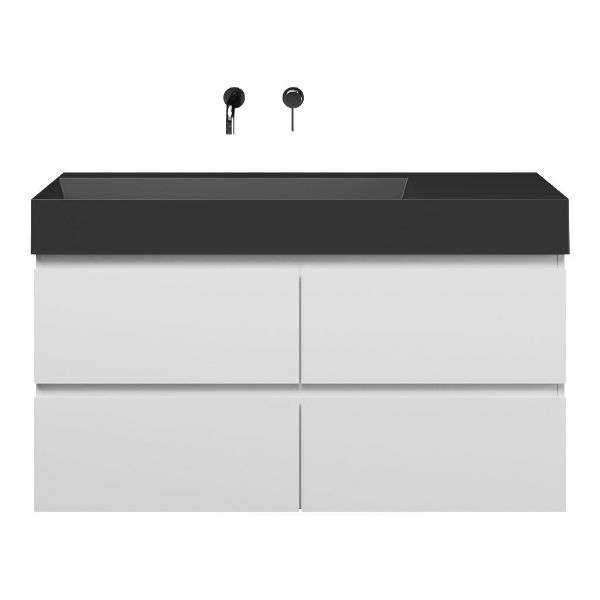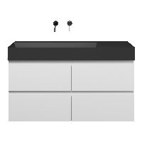 Greeploos badkamermeubel in de kleur wit mat is 120 cm breed. De wastafel is vervaardig in keramiek en heeft de kleur antraciet mat keramiek. Dit badkamermeubel met deze wastafel is leverbaar tussen de 60 cm t/m 160 cm
