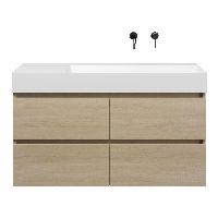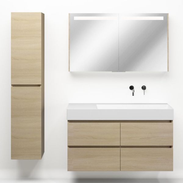 Greeploos badkamermeubel in de kleur eiken licht is 120 cm breed. De wastafel is vervaardig in keramiek en heeft de kleur wit mat keramiek. Dit badkamermeubel met deze wastafel is leverbaar tussen de 60 cm t/m 120 cm