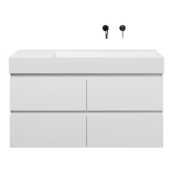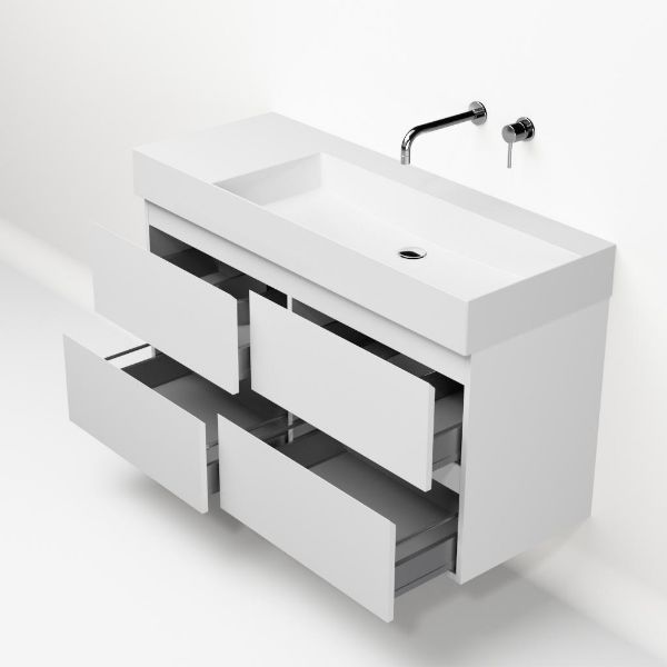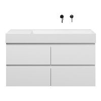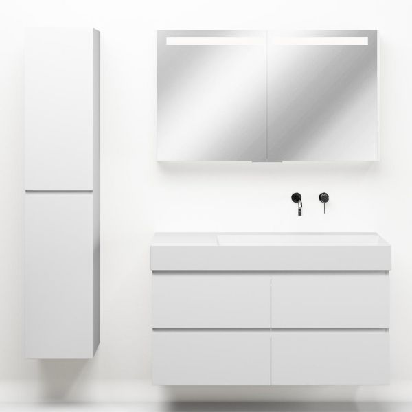 Greeploos badkamermeubel in de kleur wit mat is 120 cm breed. De wastafel is vervaardig in keramiek en heeft de kleur wit keramiek. Dit badkamermeubel met deze wastafel is leverbaar tussen de 60 cm t/m 160 cm