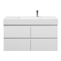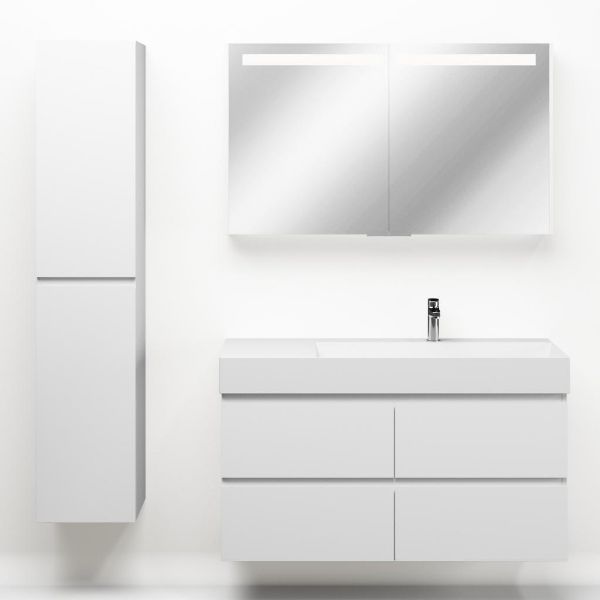 Greeploos badkamermeubel in de kleur wit mat is 120 cm breed. De wastafel is vervaardig in keramiek en heeft de kleur wit keramiek. Dit badkamermeubel met deze wastafel is leverbaar tussen de 60 cm t/m 160 cm