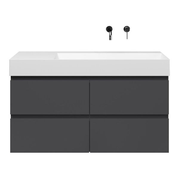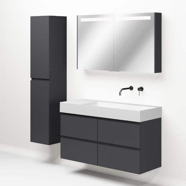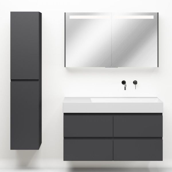 Greeploos badkamermeubel in de kleur antraciet mat is 120 cm breed. De wastafel is vervaardig in keramiek en heeft de kleur wit mat keramiek. Dit badkamermeubel met deze wastafel is leverbaar tussen de 60 cm t/m 160 cm