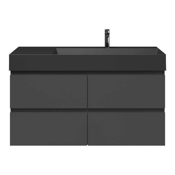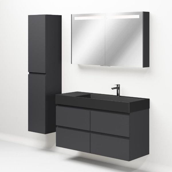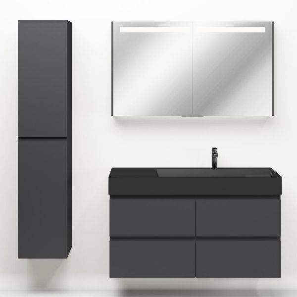 Greeploos badkamermeubel in de kleur antraciet mat is 120 cm breed. De wastafel is vervaardig in keramiek en heeft de kleur antraciet mat keramiek. Dit badkamermeubel met deze wastafel is leverbaar tussen de 60 cm t/m 160 cm