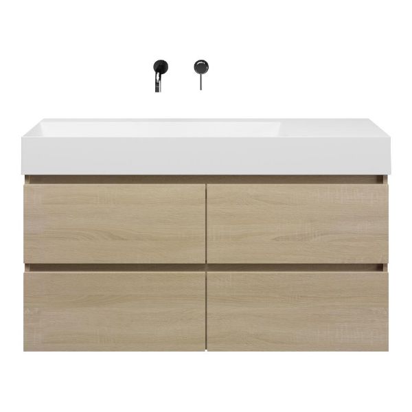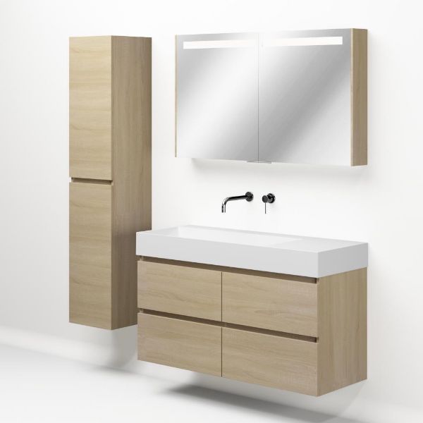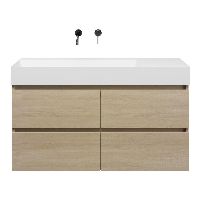 Greeploos badkamermeubel in de kleur eiken licht is 120 cm breed. De wastafel is vervaardig in keramiek en heeft de kleur wit keramiek. Dit badkamermeubel met deze wastafel is leverbaar tussen de 60 cm t/m 120 cm