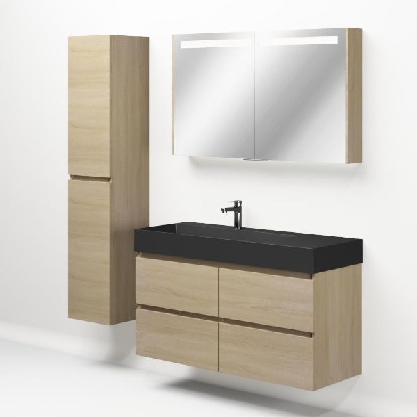 Greeploos badkamermeubel in de kleur eiken licht is 120 cm breed. De wastafel is vervaardig in keramiek en heeft de kleur antraciet mat keramiek. Dit badkamermeubel met deze wastafel is leverbaar tussen de 60 cm t/m 120 cm