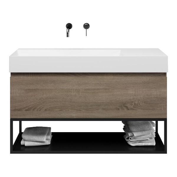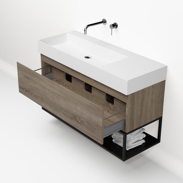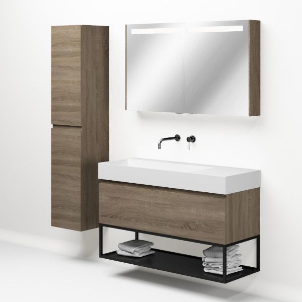 | | Bellanti Solo/Tela /Azzurra badmeubel 120x46 1 softclose lade eiken donker greeploos keramische wastafel links wit glans zonder kraangaten met mat zwart metalen frame |