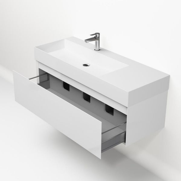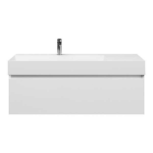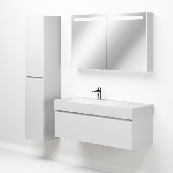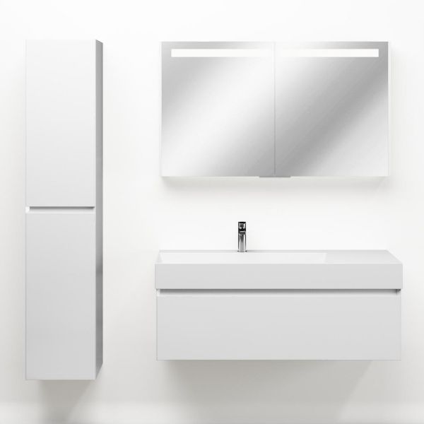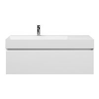 Greeploos badkamermeubel in de kleur wit hoogglans is 120 cm breed. De wastafel is vervaardig in keramiek en heeft de kleur wit keramiek. Dit badkamermeubel met deze wastafel is leverbaar tussen de 60 cm t/m 160 cm
