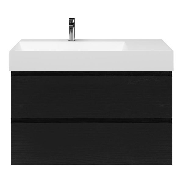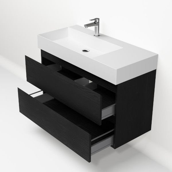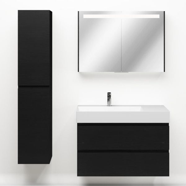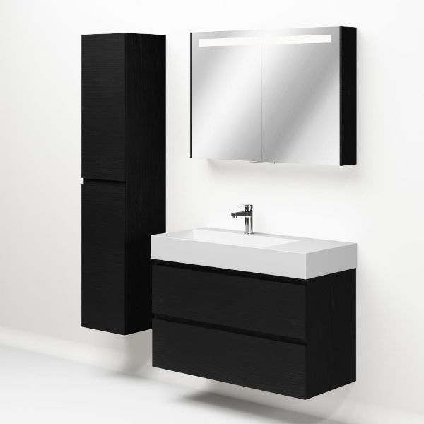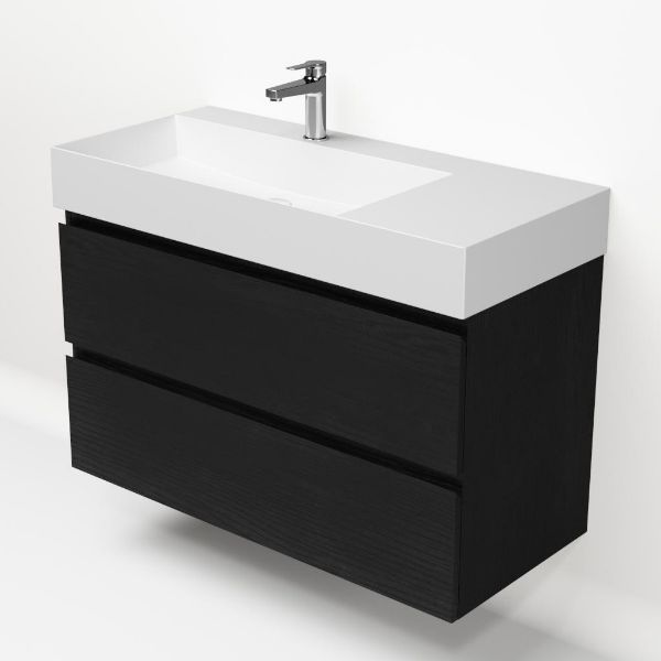 Greeploos badkamermeubel in de kleur zwart mat eiken is 100 cm breed. De wastafel is vervaardig in keramiek en heeft de kleur wit mat keramiek. Dit badkamermeubel met deze wastafel is leverbaar tussen de 60 cm t/m 160 cm