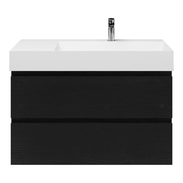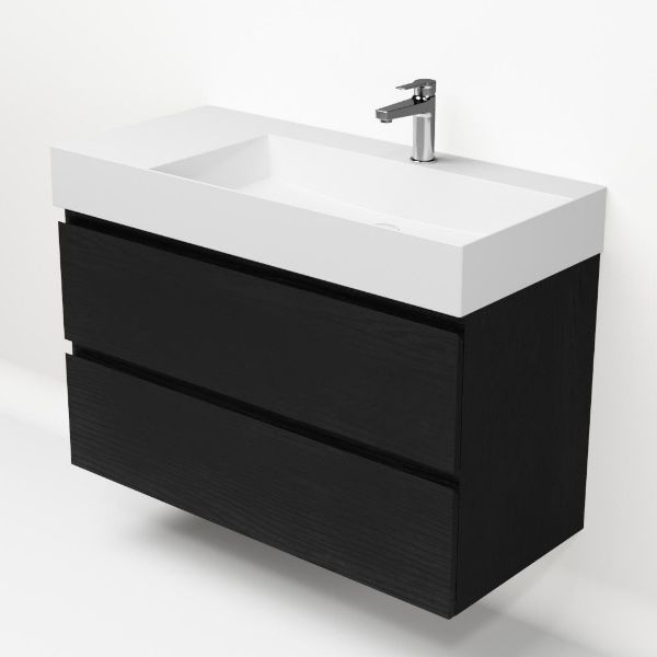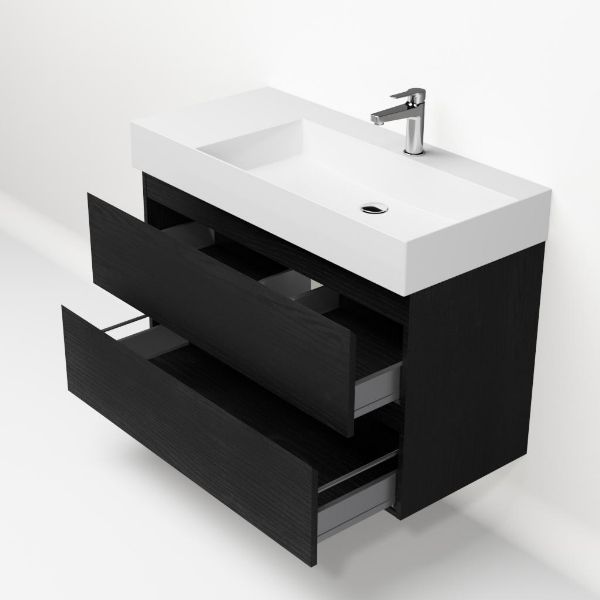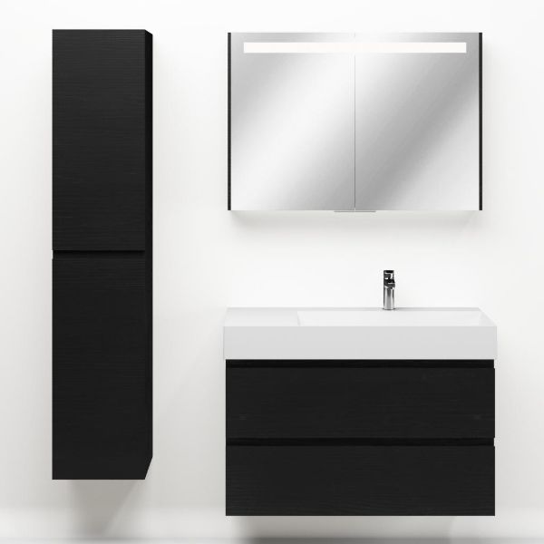 Greeploos badkamermeubel in de kleur zwart mat eiken is 100 cm breed. De wastafel is vervaardig in keramiek en heeft de kleur wit keramiek. Dit badkamermeubel met deze wastafel is leverbaar tussen de 60 cm t/m 160 cm