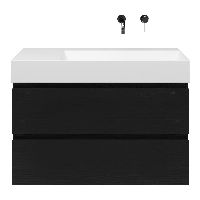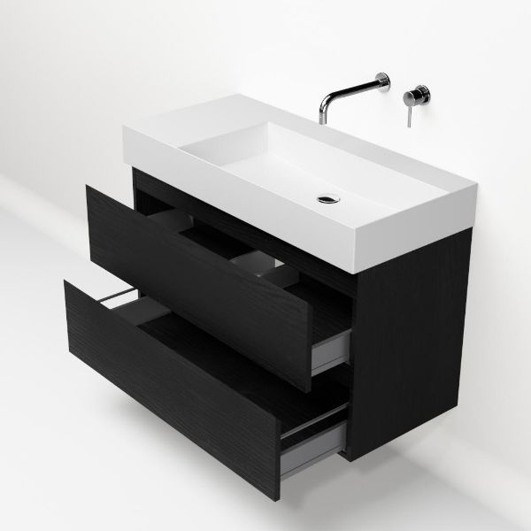 Greeploos badkamermeubel in de kleur zwart mat eiken is 100 cm breed. De wastafel is vervaardig in keramiek en heeft de kleur wit mat keramiek. Dit badkamermeubel met deze wastafel is leverbaar tussen de 60 cm t/m 160 cm