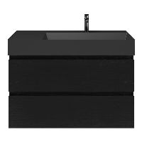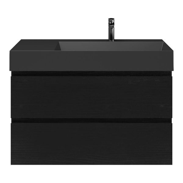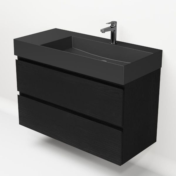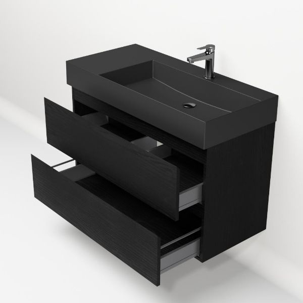 Greeploos badkamermeubel in de kleur zwart mat eiken is 100 cm breed. De wastafel is vervaardig in keramiek en heeft de kleur antraciet mat keramiek. Dit badkamermeubel met deze wastafel is leverbaar tussen de 60 cm t/m 160 cm