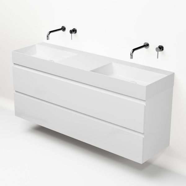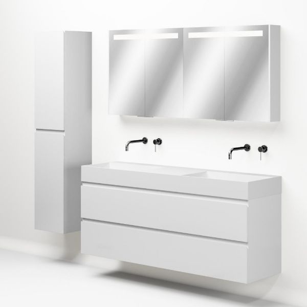 Greeploos badkamermeubel in de kleur wit hoogglans is 160 cm breed. De wastafel is vervaardig in keramiek en heeft de kleur wit keramiek. Dit badkamermeubel met deze wastafel is leverbaar tussen de 60 cm t/m 160 cm