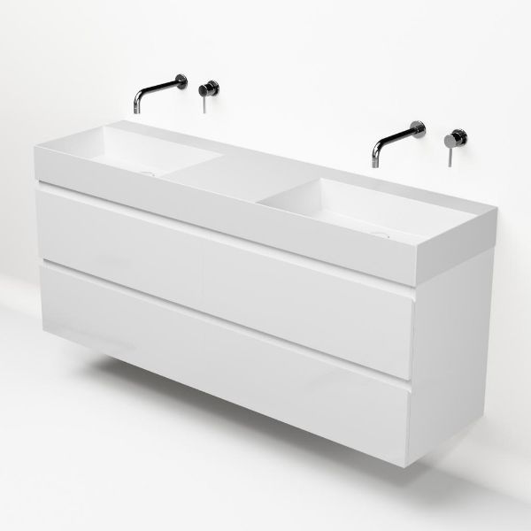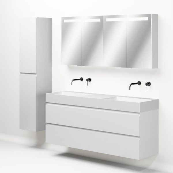 Greeploos badkamermeubel in de kleur wit hoogglans is 160 cm breed. De wastafel is vervaardig in keramiek en heeft de kleur wit mat keramiek. Dit badkamermeubel met deze wastafel is leverbaar tussen de 60 cm t/m 160 cm