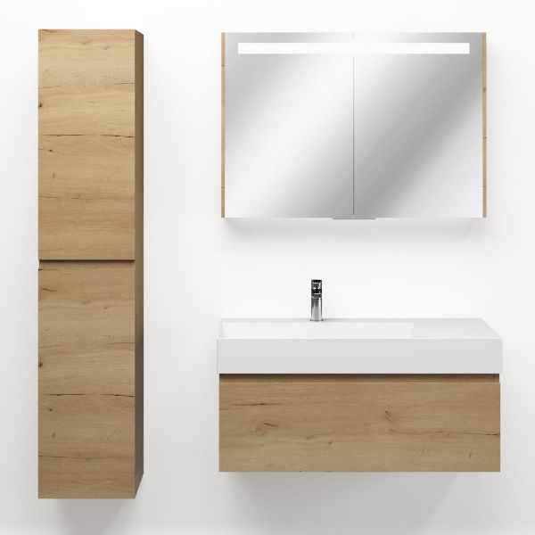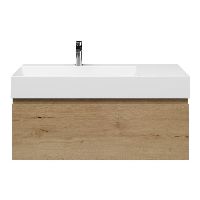 Greeploos badkamermeubel in de kleur eiken natuur is 100 cm breed. De wastafel is vervaardig in keramiek en heeft de kleur wit keramiek. Dit badkamermeubel met deze wastafel is leverbaar tussen de 60 cm t/m 160 cm