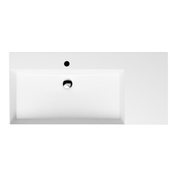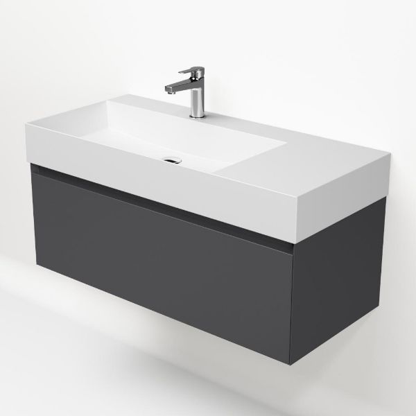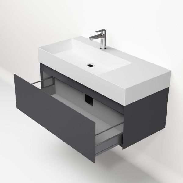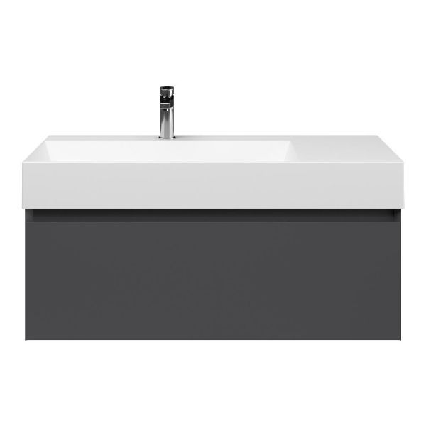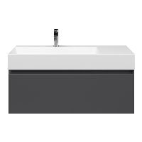 Greeploos badkamermeubel in de kleur antraciet mat is 100 cm breed. De wastafel is vervaardig in keramiek en heeft de kleur wit mat keramiek. Dit badkamermeubel met deze wastafel is leverbaar tussen de 60 cm t/m 160 cm