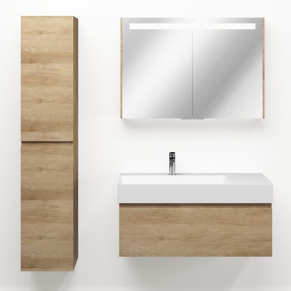 Greeploos badkamermeubel in de kleur olm is 100 cm breed. De wastafel is vervaardig in keramiek en heeft de kleur wit mat keramiek. Dit badkamermeubel met deze wastafel is leverbaar tussen de 60 cm t/m 160 cm