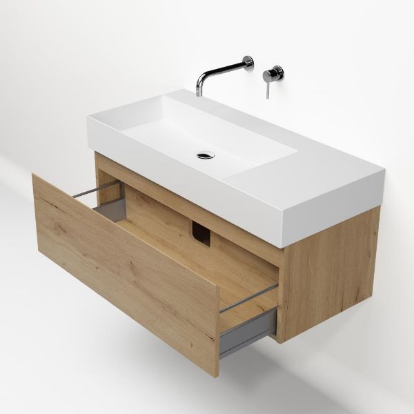 | | Bellanti Solo/Azzurra badmeubel 100x46 1 softclose lade eiken natuur greeploos keramische wastafel links wit mat zonder kraangaten |