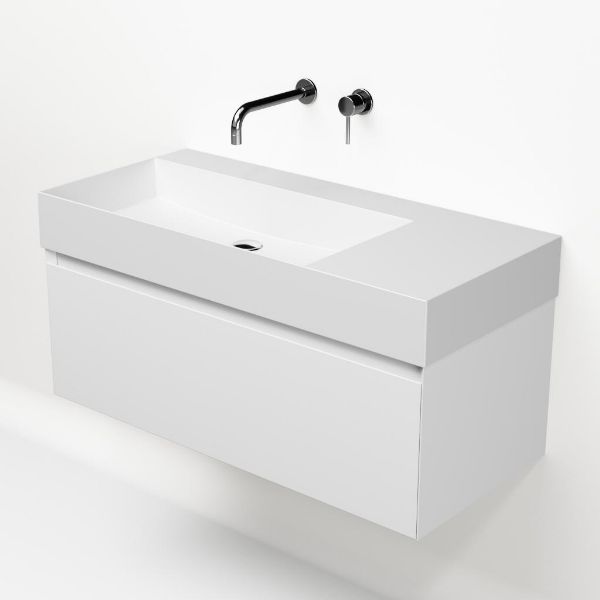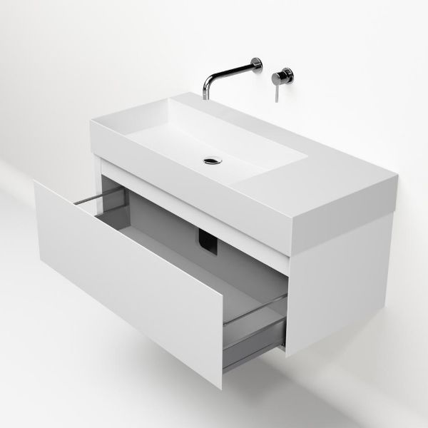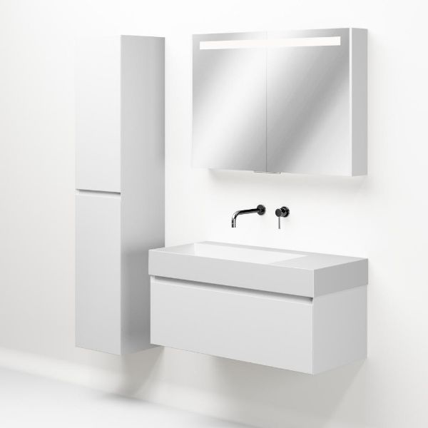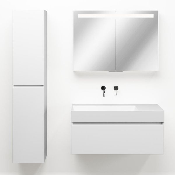 Greeploos badkamermeubel in de kleur wit mat is 100 cm breed. De wastafel is vervaardig in keramiek en heeft de kleur wit mat keramiek. Dit badkamermeubel met deze wastafel is leverbaar tussen de 60 cm t/m 160 cm