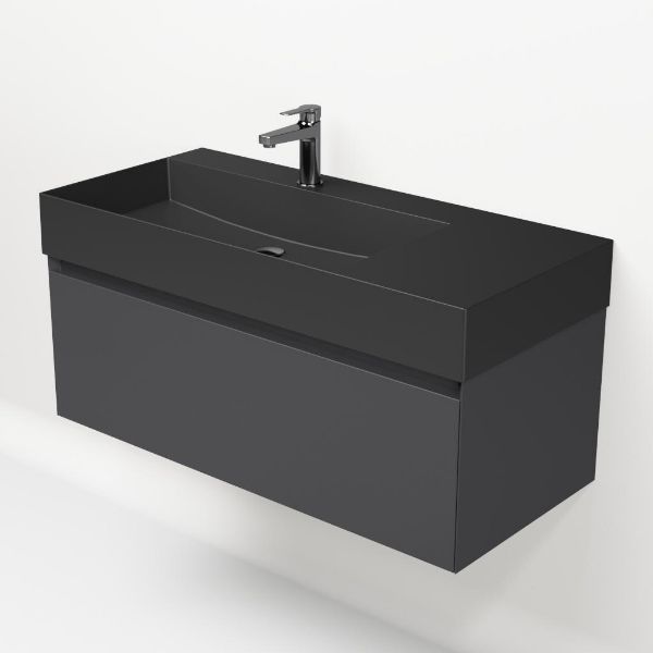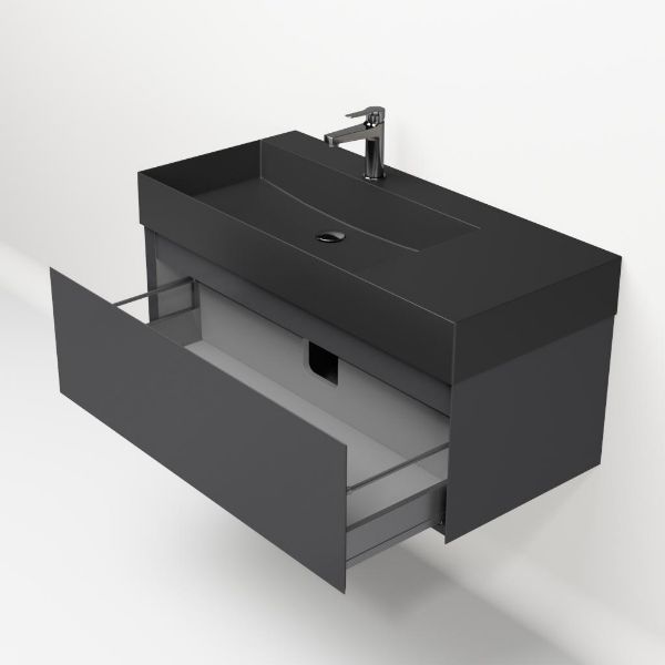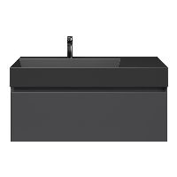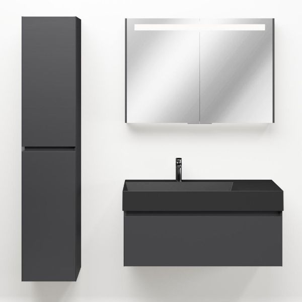Greeploos badkamermeubel in de kleur antraciet mat is 100 cm breed. De wastafel is vervaardig in keramiek en heeft de kleur antraciet mat keramiek. Dit badkamermeubel met deze wastafel is leverbaar tussen de 60 cm t/m 160 cm