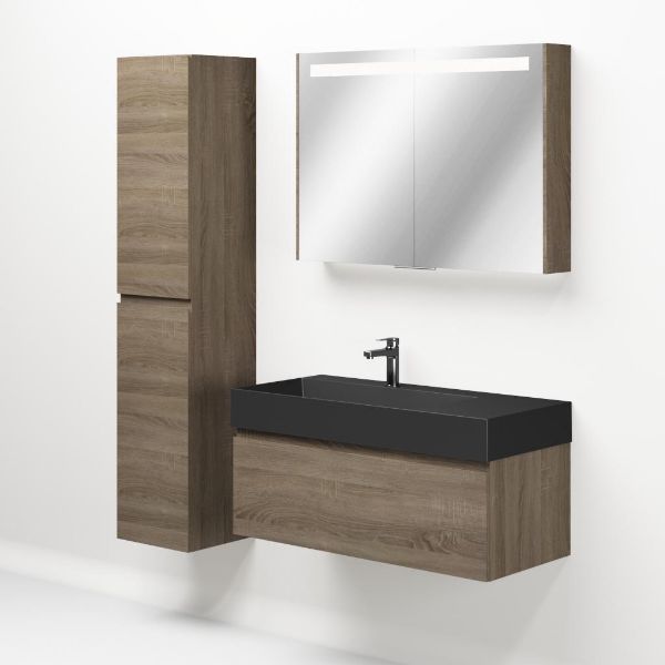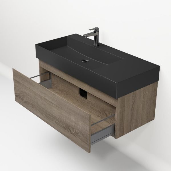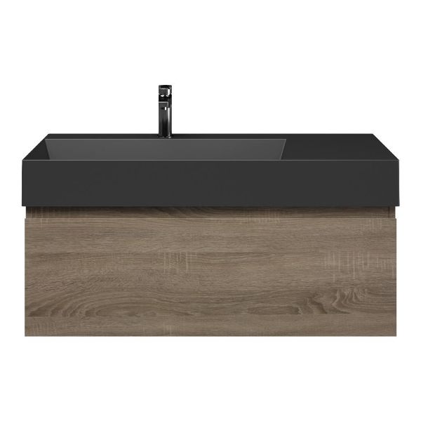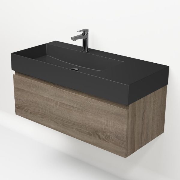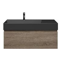 Greeploos badkamermeubel in de kleur eiken donker is 100 cm breed. De wastafel is vervaardig in keramiek en heeft de kleur antraciet mat keramiek. Dit badkamermeubel met deze wastafel is leverbaar tussen de 60 cm t/m 160 cm