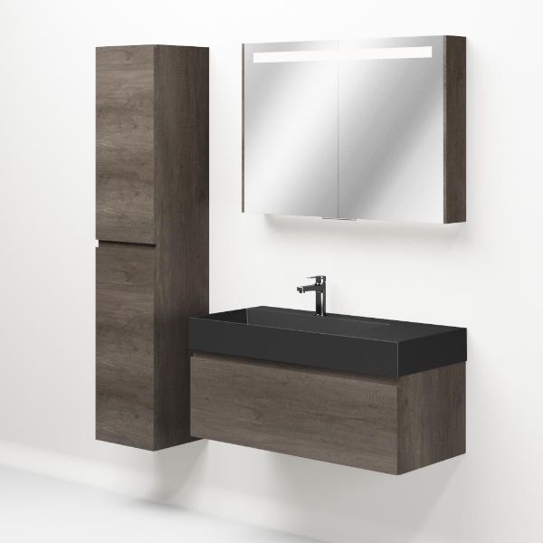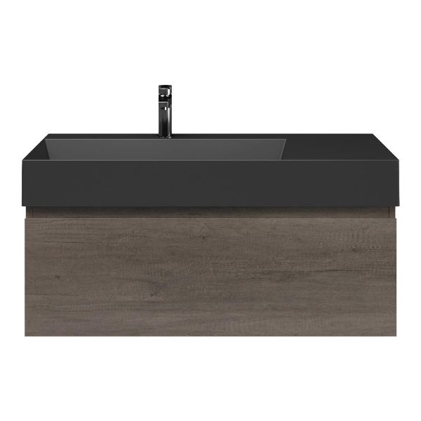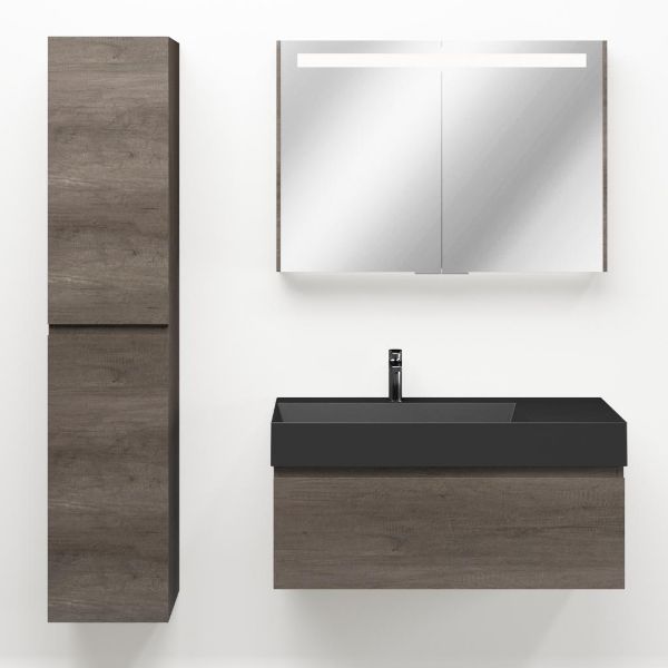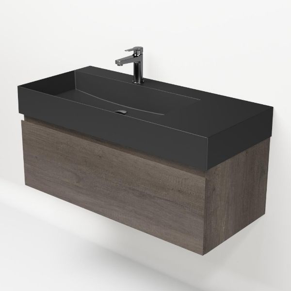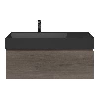 Greeploos badkamermeubel in de kleur olm donker grijs is 100 cm breed. De wastafel is vervaardig in keramiek en heeft de kleur antraciet mat keramiek. Dit badkamermeubel met deze wastafel is leverbaar tussen de 60 cm t/m 160 cm