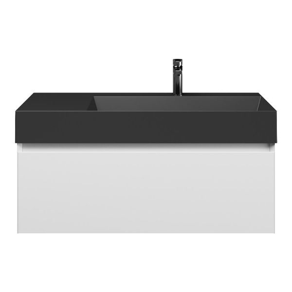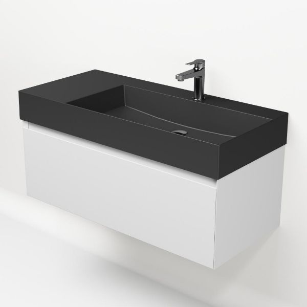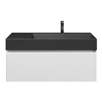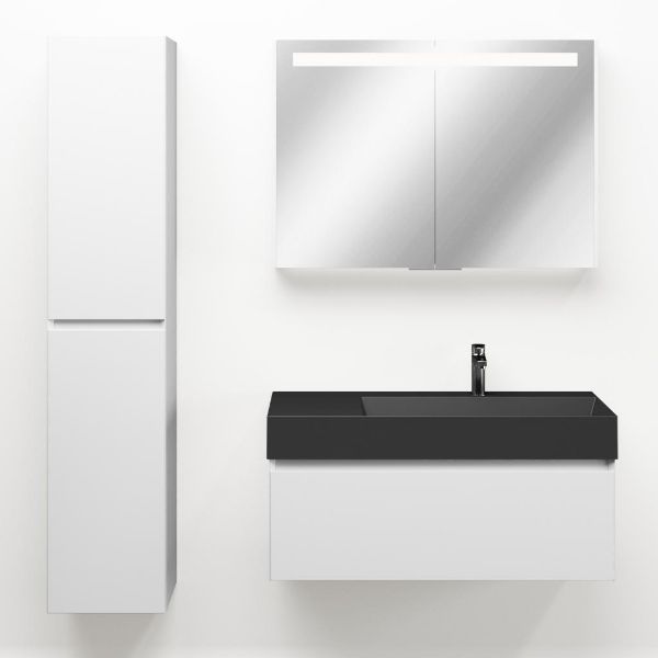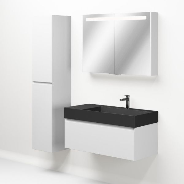 Greeploos badkamermeubel in de kleur wit mat is 100 cm breed. De wastafel is vervaardig in keramiek en heeft de kleur antraciet mat keramiek. Dit badkamermeubel met deze wastafel is leverbaar tussen de 60 cm t/m 160 cm