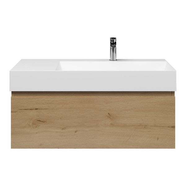 Greeploos badkamermeubel in de kleur eiken natuur is 100 cm breed. De wastafel is vervaardig in keramiek en heeft de kleur wit mat keramiek. Dit badkamermeubel met deze wastafel is leverbaar tussen de 60 cm t/m 160 cm