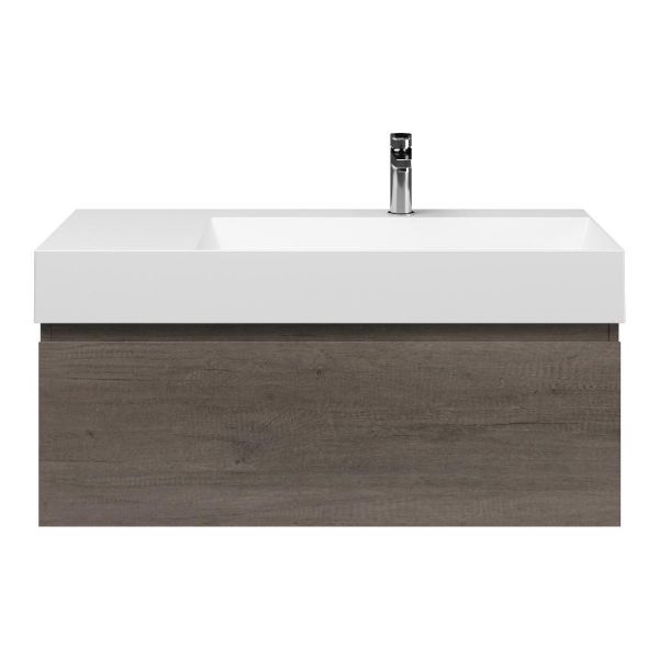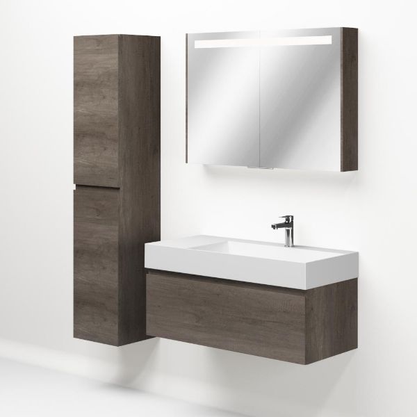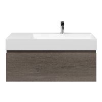 Greeploos badkamermeubel in de kleur olm donker grijs is 100 cm breed. De wastafel is vervaardig in keramiek en heeft de kleur wit mat keramiek. Dit badkamermeubel met deze wastafel is leverbaar tussen de 60 cm t/m 160 cm