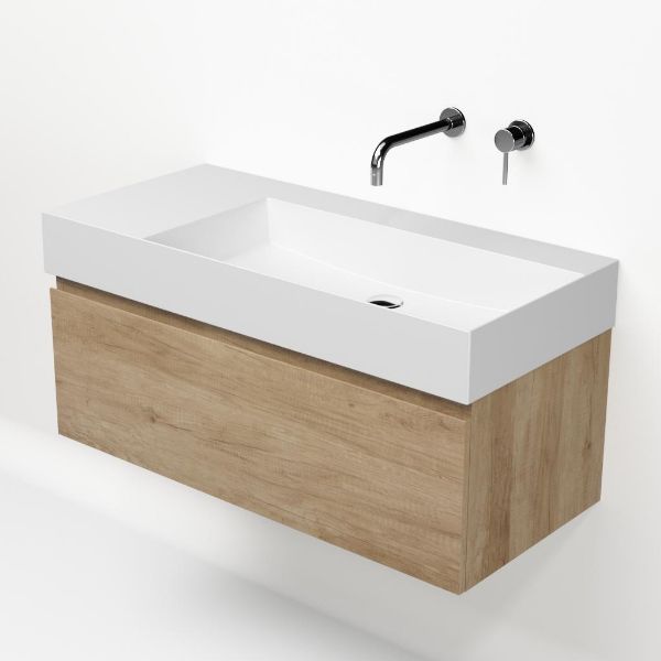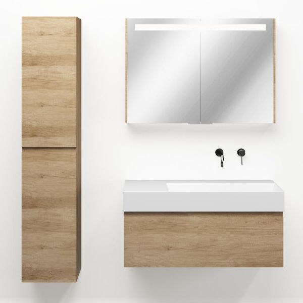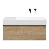 Greeploos badkamermeubel in de kleur olm is 100 cm breed. De wastafel is vervaardig in keramiek en heeft de kleur wit mat keramiek. Dit badkamermeubel met deze wastafel is leverbaar tussen de 60 cm t/m 160 cm