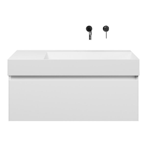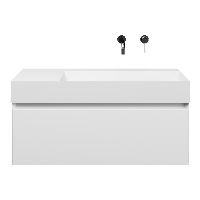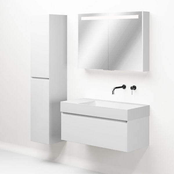 Greeploos badkamermeubel in de kleur wit mat is 100 cm breed. De wastafel is vervaardig in keramiek en heeft de kleur wit keramiek. Dit badkamermeubel met deze wastafel is leverbaar tussen de 60 cm t/m 160 cm