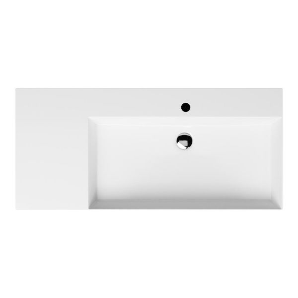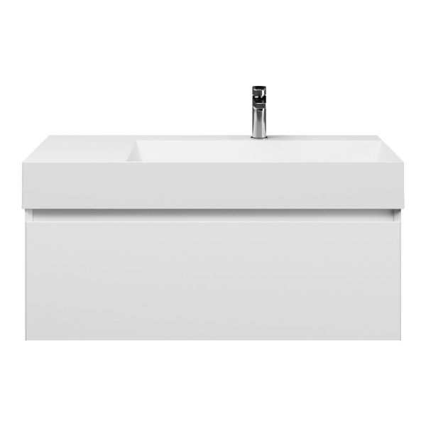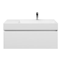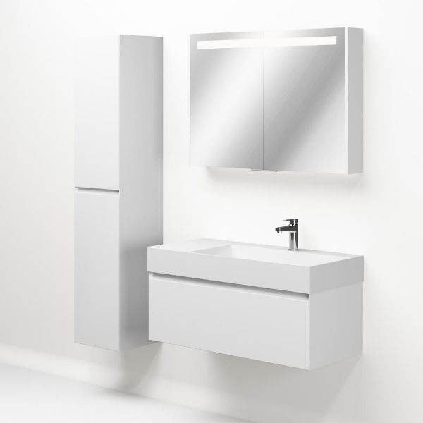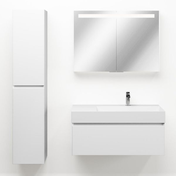 Greeploos badkamermeubel in de kleur wit mat is 100 cm breed. De wastafel is vervaardig in keramiek en heeft de kleur wit keramiek. Dit badkamermeubel met deze wastafel is leverbaar tussen de 60 cm t/m 160 cm