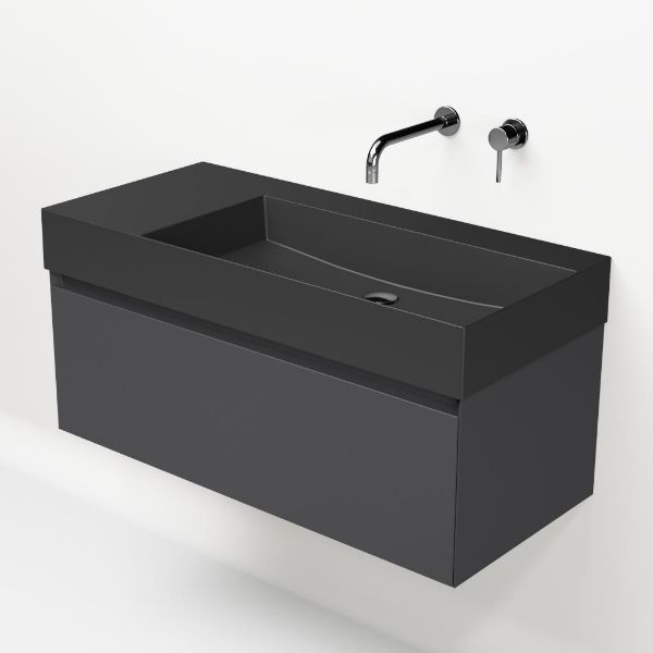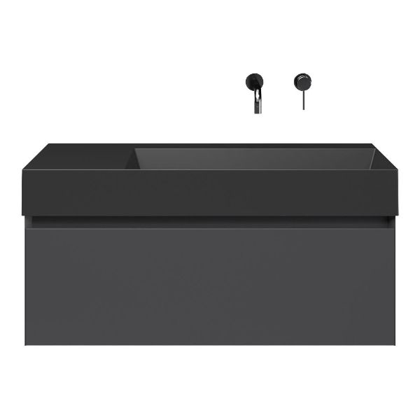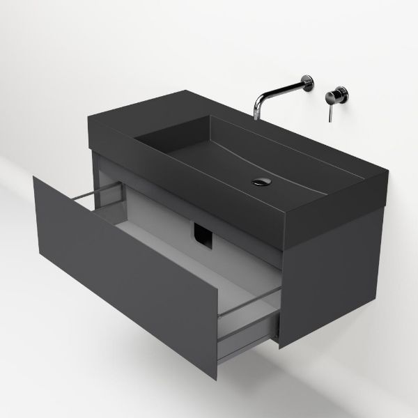 Greeploos badkamermeubel in de kleur antraciet mat is 100 cm breed. De wastafel is vervaardig in keramiek en heeft de kleur antraciet mat keramiek. Dit badkamermeubel met deze wastafel is leverbaar tussen de 60 cm t/m 160 cm