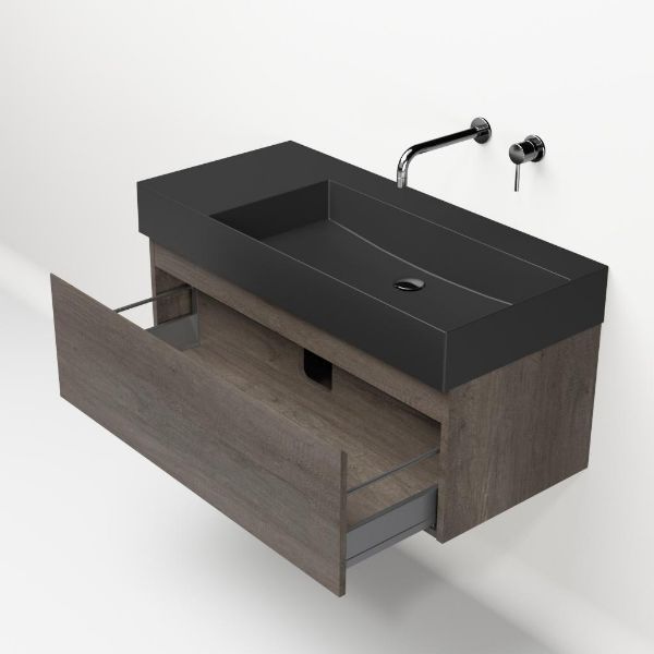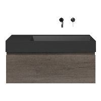 Greeploos badkamermeubel in de kleur olm donker grijs is 100 cm breed. De wastafel is vervaardig in keramiek en heeft de kleur antraciet mat keramiek. Dit badkamermeubel met deze wastafel is leverbaar tussen de 60 cm t/m 160 cm
