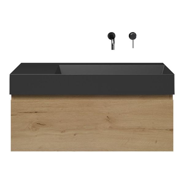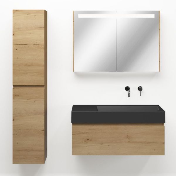 Greeploos badkamermeubel in de kleur eiken natuur is 100 cm breed. De wastafel is vervaardig in keramiek en heeft de kleur antraciet mat keramiek. Dit badkamermeubel met deze wastafel is leverbaar tussen de 60 cm t/m 160 cm