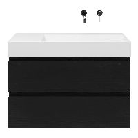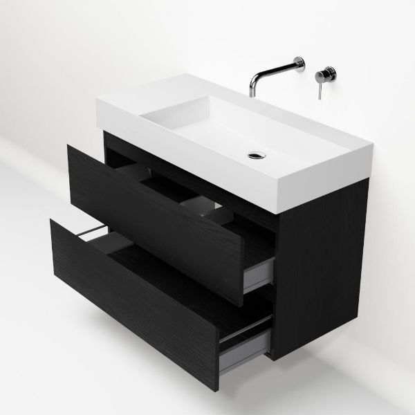 Greeploos badkamermeubel in de kleur zwart mat eiken is 100 cm breed. De wastafel is vervaardig in keramiek en heeft de kleur wit keramiek. Dit badkamermeubel met deze wastafel is leverbaar tussen de 60 cm t/m 160 cm