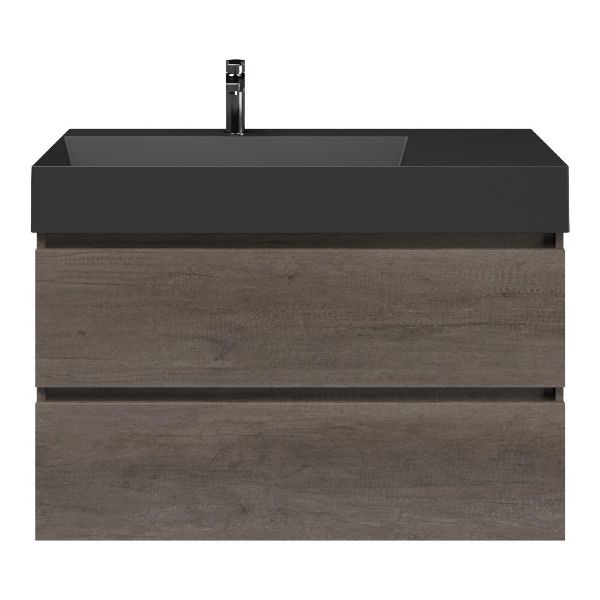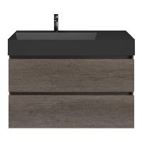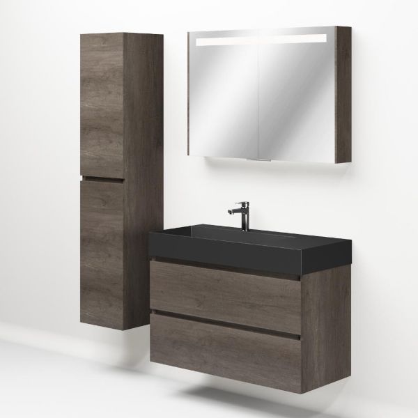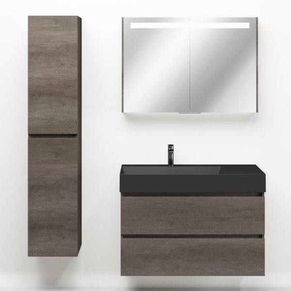 Greeploos badkamermeubel in de kleur olm donker grijs is 100 cm breed. De wastafel is vervaardig in keramiek en heeft de kleur antraciet mat keramiek. Dit badkamermeubel met deze wastafel is leverbaar tussen de 60 cm t/m 120 cm