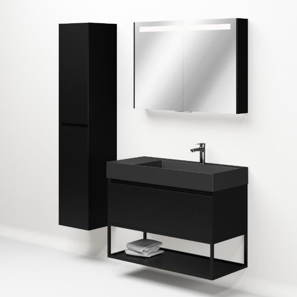 Greeploos badkamermeubel in de kleur zwart mat is 100 cm breed. De wastafel is vervaardig in keramiek en heeft de kleur antraciet mat keramiek. Dit badkamermeubel met deze wastafel is leverbaar tussen de 60 cm t/m 140 cm