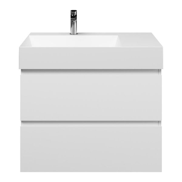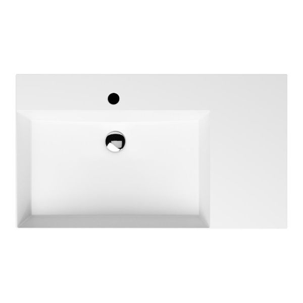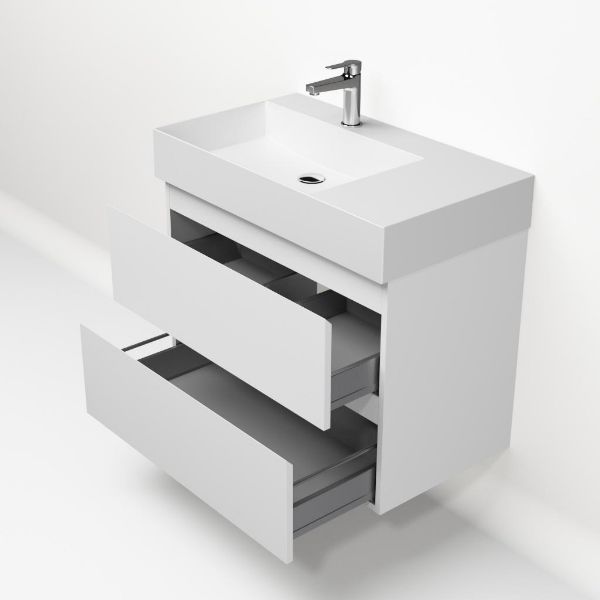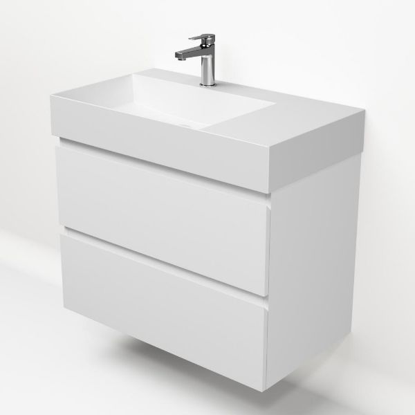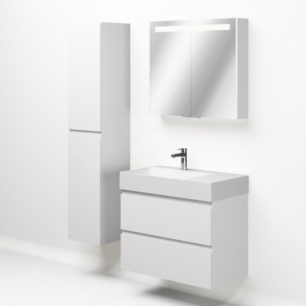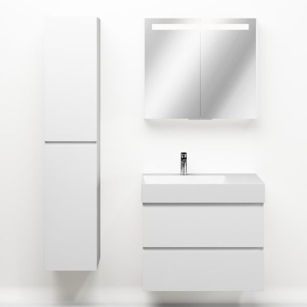 Greeploos badkamermeubel in de kleur wit mat is 80 cm breed. De wastafel is vervaardig in keramiek en heeft de kleur wit mat keramiek. Dit badkamermeubel met deze wastafel is leverbaar tussen de 60 cm t/m 160 cm